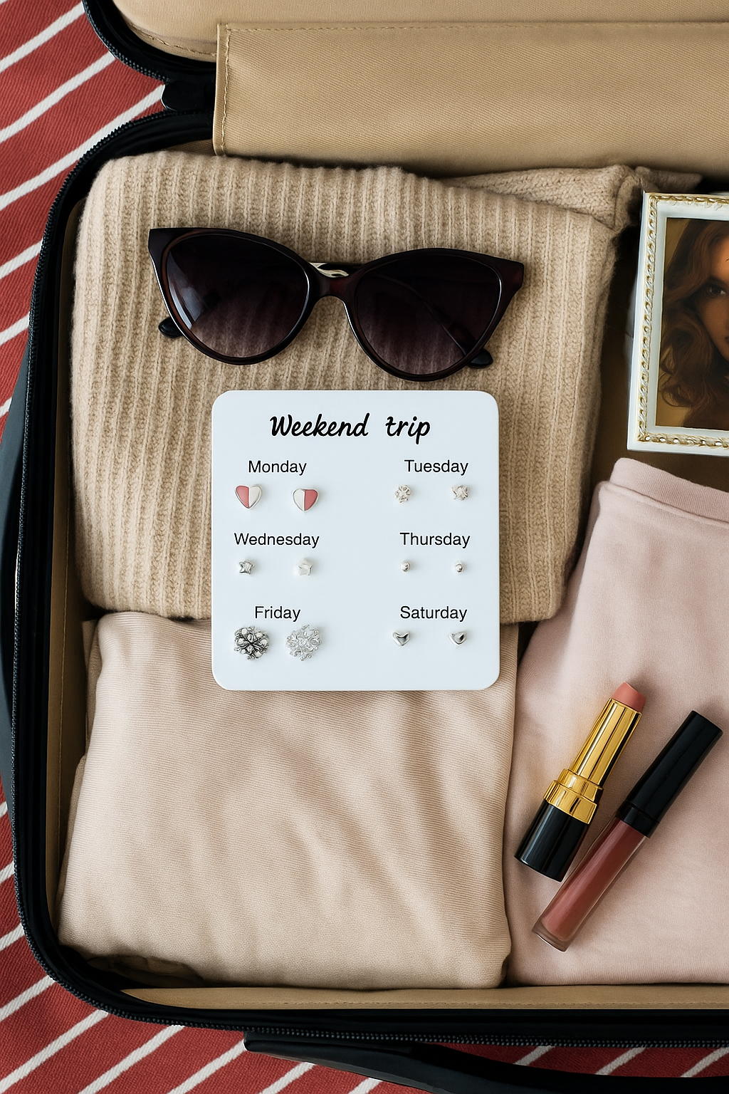 Add a playful sparkle to your week with this 7-pair stud earrings set designed for every day of the week! Featuring adorable motifs like pink hearts, silver stars, dazzling crystals, snowflakes, and classic studs, this daily earring set is perfect for girls, teens, and anyone who loves rotating their jewelry style.