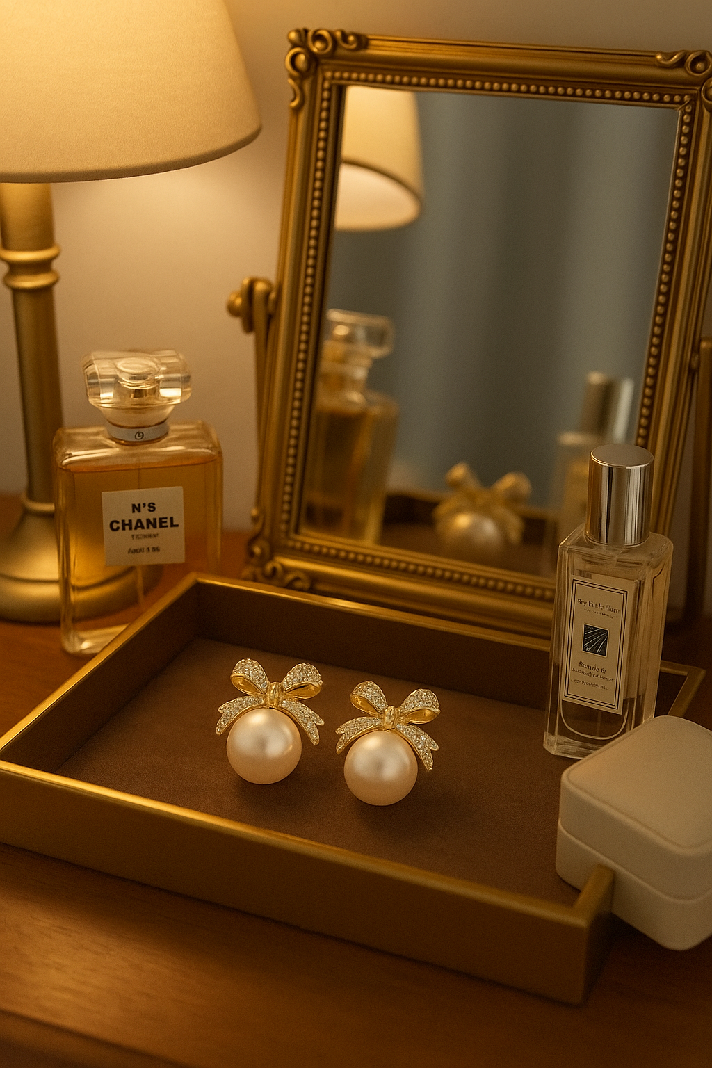 Elegant Gold Bow Pearl Stud Earrings for Women – Dainty Crystal Ribbon Design, Bridal & Party Jewelry