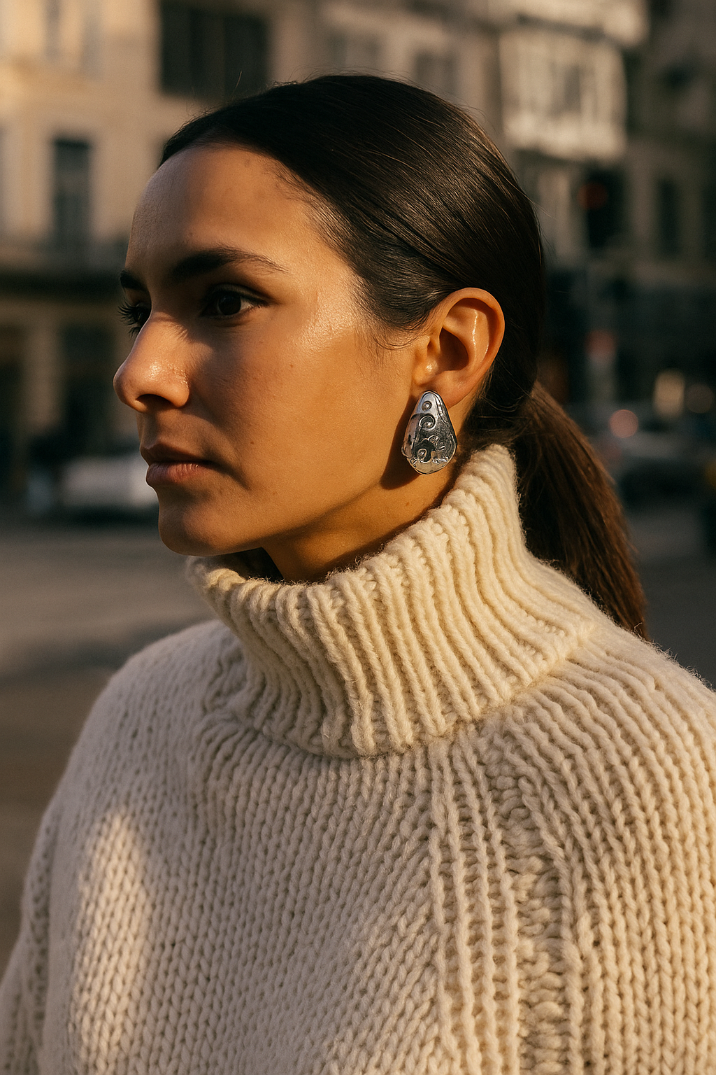 Crafted with precision and comfort in mind, each earring measures 2.67 cm in height and 1.59 cm in width, with a lightweight design at just 16.84g. The curved teardrop silhouette hugs the ear beautifully, offering a bold yet balanced look perfect for evening events, date nights, or everyday glamour.